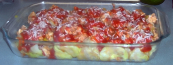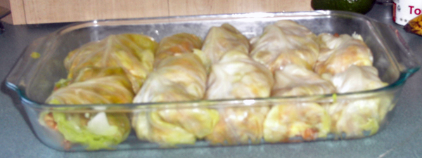 (Above): Cabbage Rolls before sauce (left), and then (right) after adding sauce.