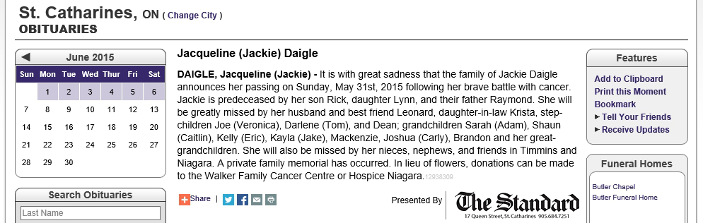 Jackie's obituary appeared in The Standard newspaper in St. Catharines, Ontario, Canada: