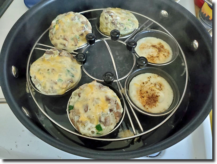 In a bowl, beat eggs together with milk, Lawry's Seasoned Salt and black pepper. Stir in mushrooms, onion, leftover cooked ham and spinach. Mix well. Pour by 3/4 cup measurement into poaching cups lightly coated with nonstick cooking spray. Place about 1/4-inch water on the bottom of a round cooking skillet. Place cooking rack in water, and then place poaching cups into fitted slots. Cover skillet and place skillet over medium heat on stovetop. Steam gently for about four to six minutes, or until eggs are set. Mixture may rise during cooking process. A minute before the end of cooking time, sprinkle tops of egg cups with finely shredded cheddar cheese. Slide cooked eggs from poaching cups onto a large plate or platter; serve.