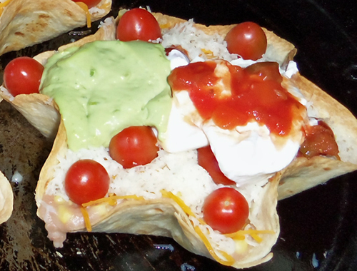 After baking tortilla molds (see above), layer prepared fillings inside of each shell. Add beef/onion mixture first, then spoon refried beans over top. Add sliced green olives and kernel corn. Add the grated cheeses, spreading evenly. Add grape or cherry tomatoes. Dollop guacamole and sour cream on top; drizzle Picante Sauce over sour cream. Place filled shells on a cookie sheet and broil on low heat for about two or three minutes, or until cheese melts. Spread shredded lettuce on top; serve.