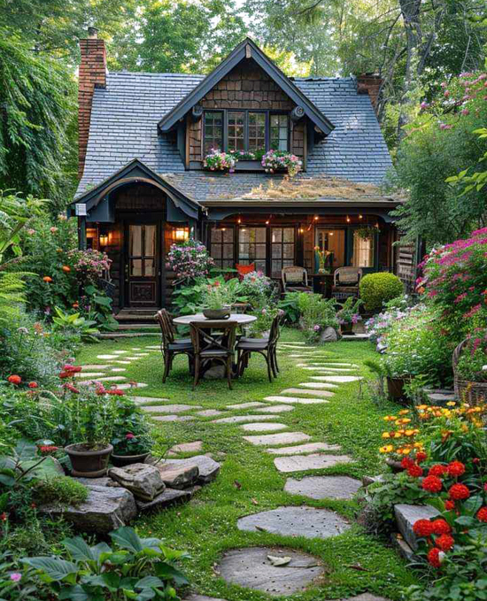 The cottage is clapboard slate-gray, with two chimneys and a fenced rear garden. The garden contains a collection of lilac bushes, roses, tulips, peonies and larkspur.